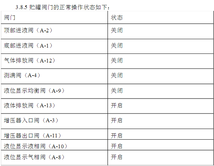 3.9.2明確除液位計(jì)液相閥(A-10)和液位計(jì)氣相閥(A-8)外,所有閥均被關(guān)閉。