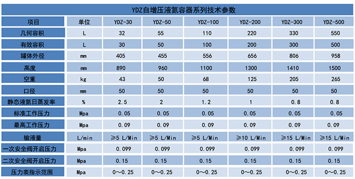 注:承接各類特殊低溫容器,表中未列出的規(guī)格(15L-800L),可按客戶要求制作,具體商議。100L及以上可配液位計(jì);其中YDZ-**W代表臥式液氮罐。